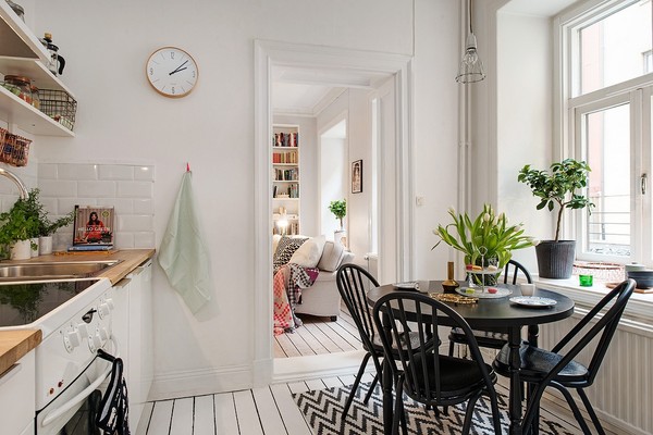 Khu vực nhà bếp với sắc trắng chủ đạo khiến nó trở nên vô cùng thanh lịch, giản dị khi đi cùng đồ nội thất đen. Không tốn quá nhiều công sức để trang trí, việc lựa chọn gam màu đen – trắng đã tự làm chúng tôn lên nét nổi bật lẫn nhau.