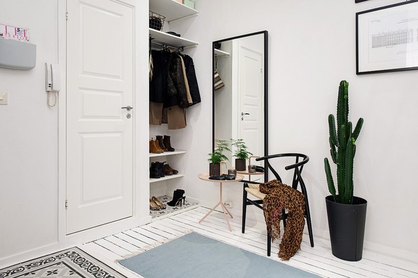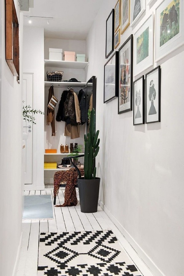 Hành lang nhỏ được tận dụng một cách triệt để với đủ đồ và chiếc gương lớn cho phép chỉnh trang mỗi khi ra vào căn hộ. Mảng tường lớn 2 bên hành lang cũng được trưng dụng để bày những khung tranh yêu thích. Chúng giúp người xem có cảm giác như đang đứng trước một mảng tưởng trong phòng triển lãm thực sự vậy.