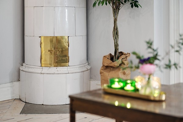 Với việc sử dụng sắc trắng rộng rãi, căn hộ cũng đặc biệt chú ý đến việc đem lại cảm giác ấm áp hơn với việc lựa chọn chất liệu sàn nhà bằng gỗ tự nhiên, lò sưởi lớn theo phong cách La Mã cổ cho phòng khách.