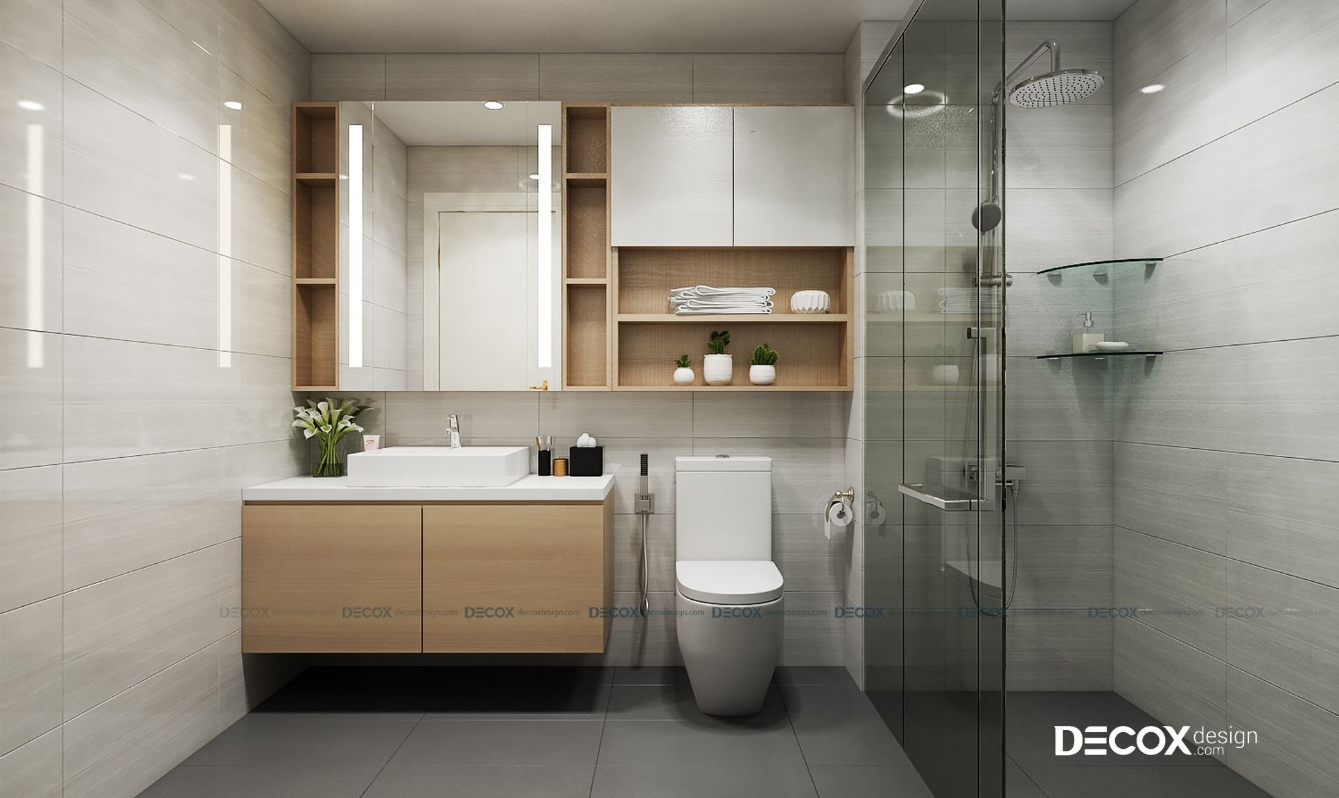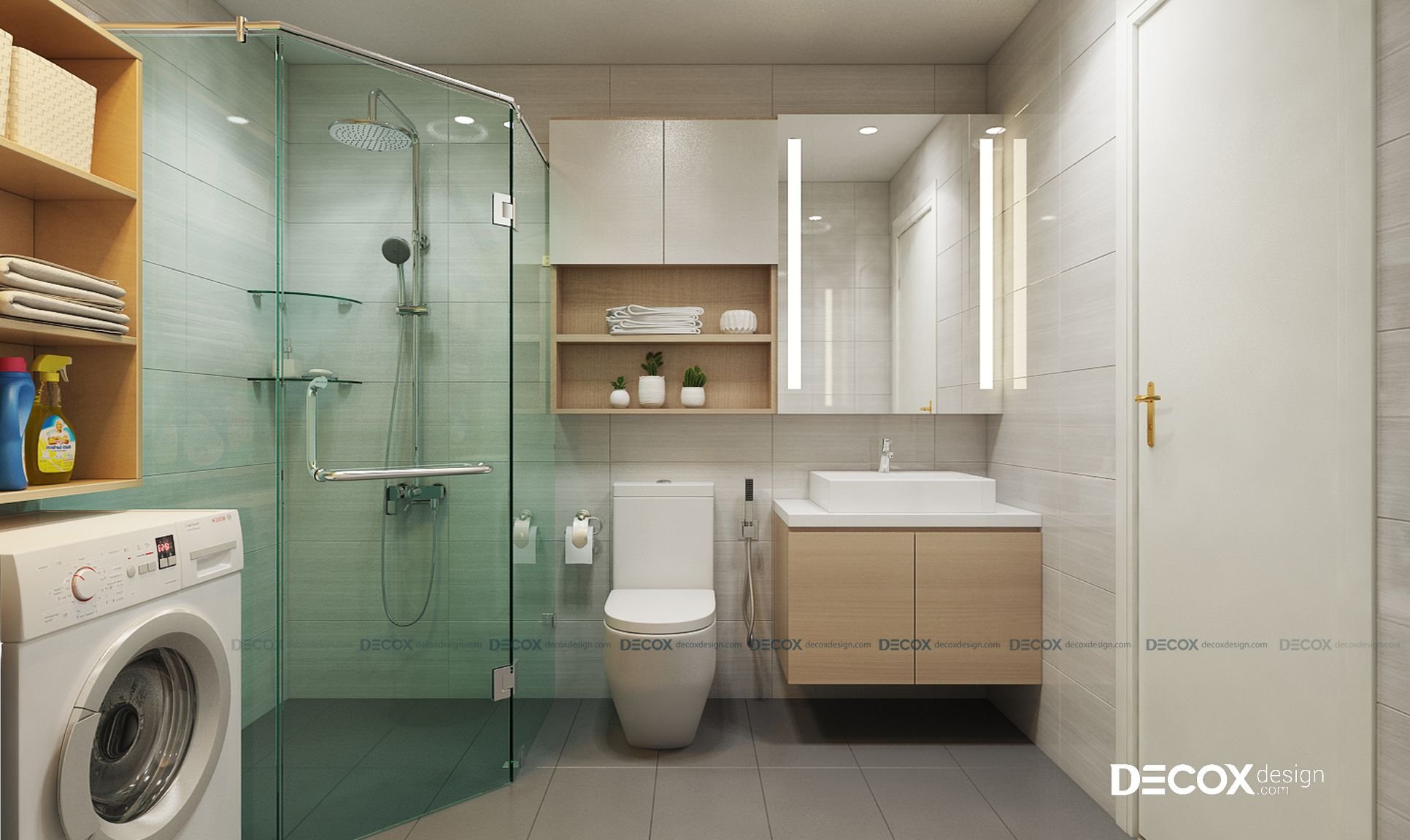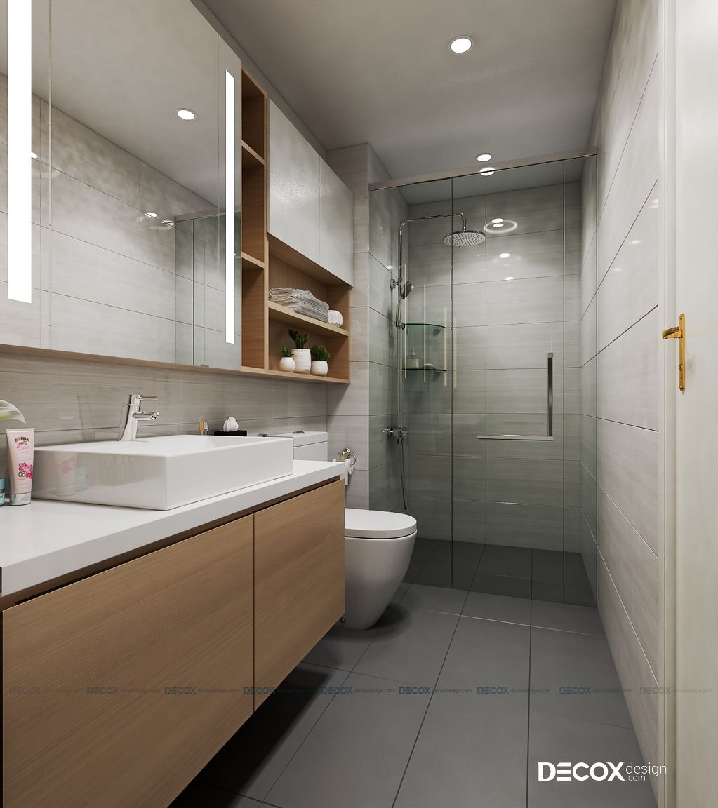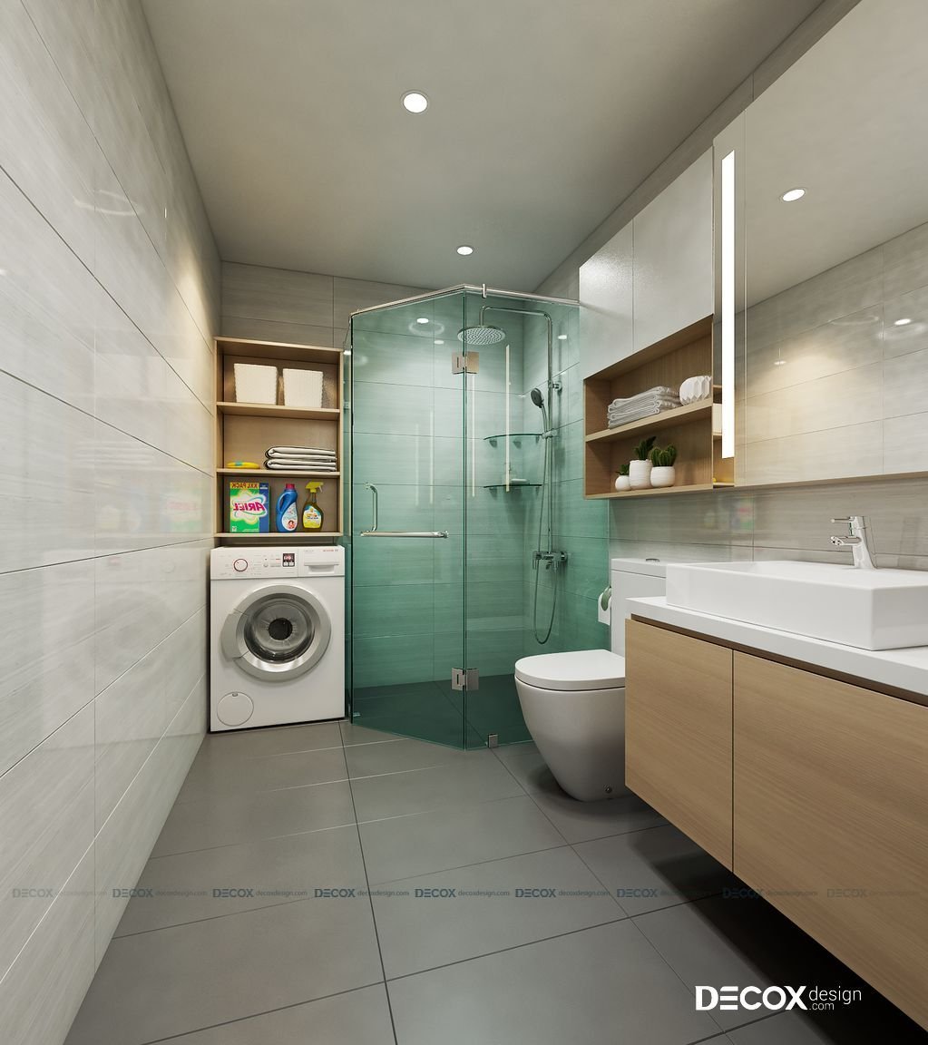 Một điểm nổi bật trong thiết kế nội thất căn hộ này đó là khu vệ sinh và phòng tắm được thiết kế tích hợp nhưng vẫn tách biệt rõ ràng công năng sử dụng của từng khu vực. Phòng tắm được thiết kế bằng kính nhằm tiết kiệm diện tích. Khu vệ sinh được thiết kế với các kệ tủ cao bằng gỗ vừa tận dụng tuyệt đối không gian vừa đựng được các vật dụng cần thiết.