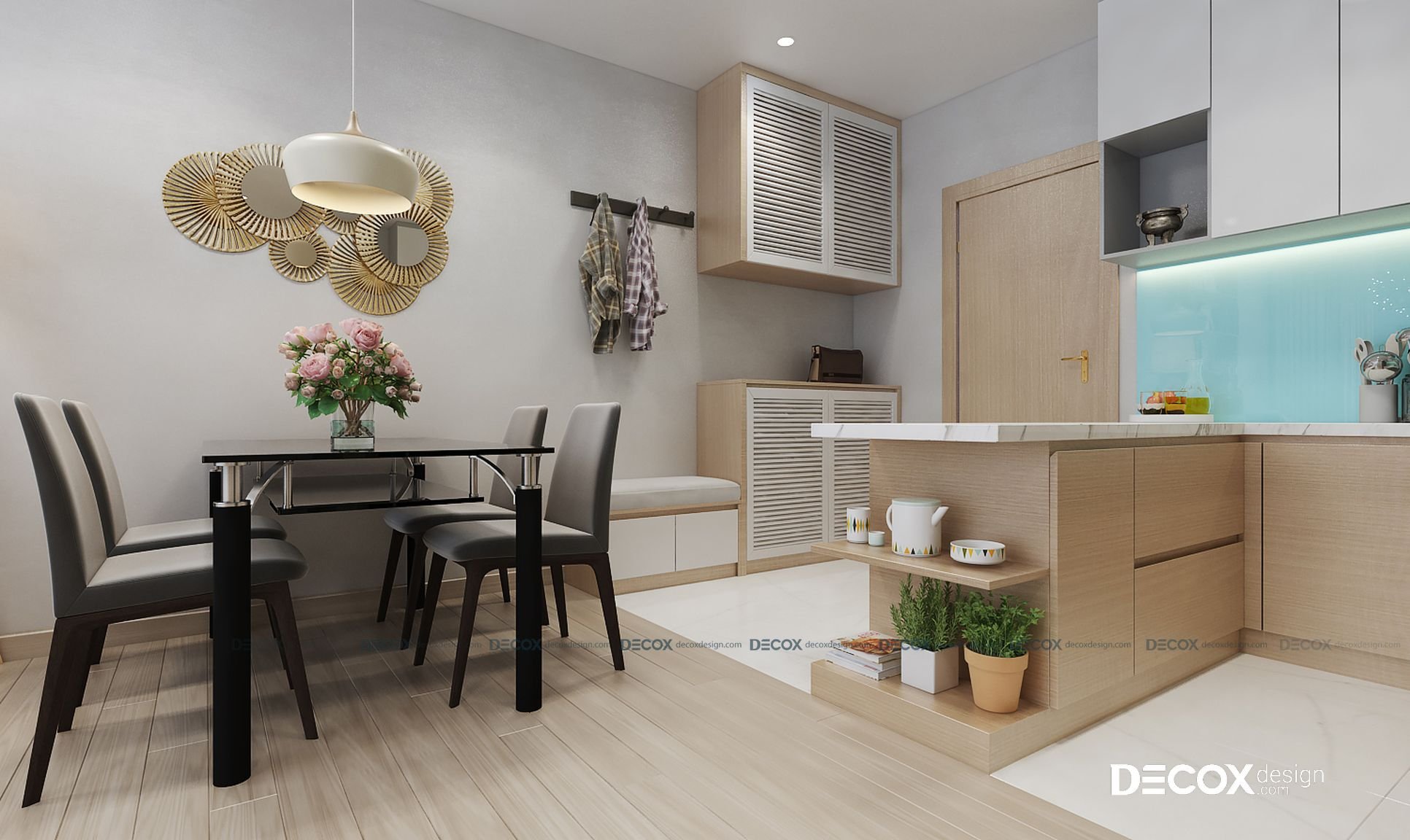 Nối tiếp khu vực phòng khách đó là không gian bếp đầy ấm cúng. Sàn của khu vực bàn ăn được ốp gỗ cao cấp kết hợp rất hoài hòa cùng với bàn ăn bốn chỗ ngồi. Bên cạnh đó là đèn thả với ánh sáng nhẹ nhàng chắc chắn sẽ làm cho bữa cơm của gia đình bạn không chỉ ngon mà còn thật ấm áp.