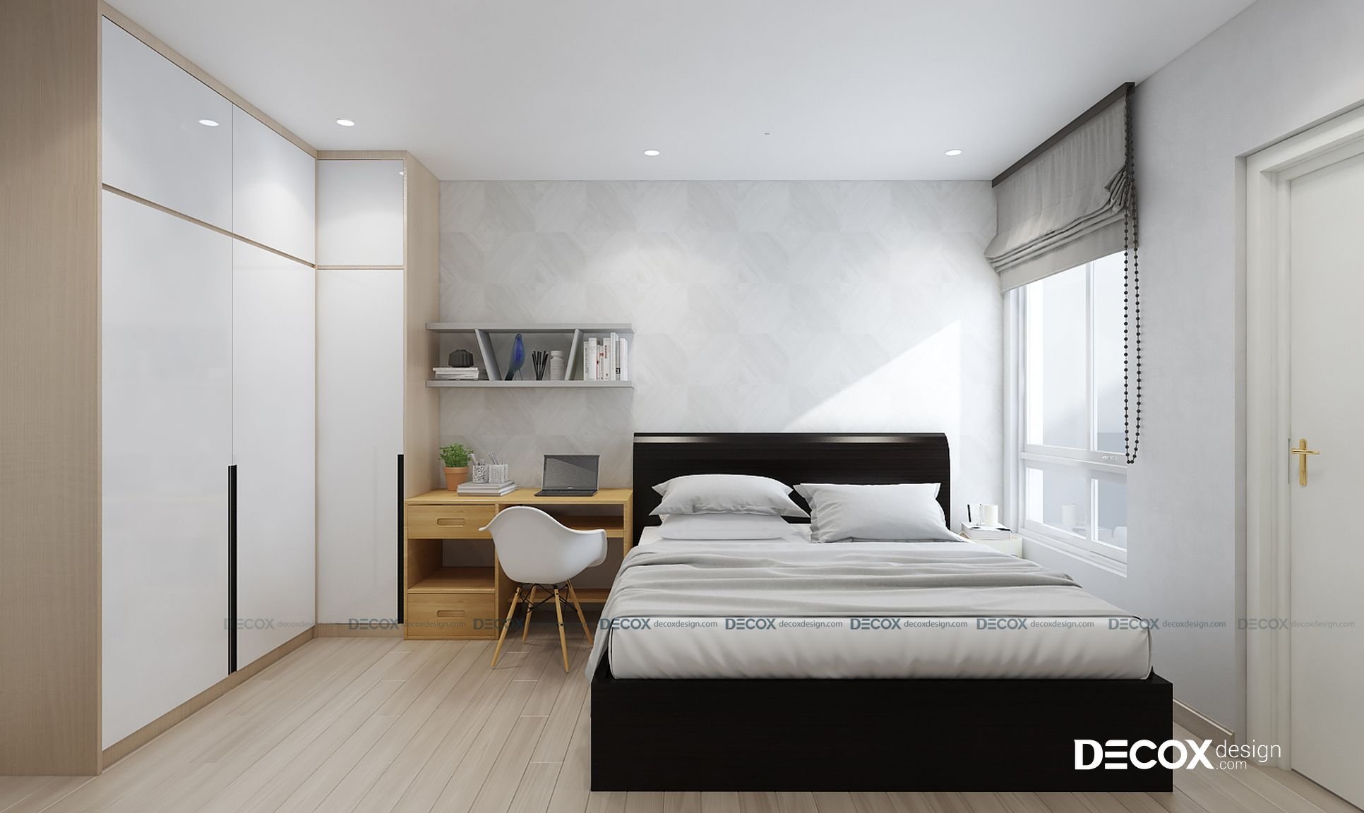 Các mảng tường của phòng ngủ được Noithatchungcu thiết kế với gam màu trắng làm chủ đạo, kết hợp rất đồng bộ với giường ngủ màu đen và sàn gỗ nhạt màu. Bàn làm việc bằng gỗ công nghiệp được đặt gọn gàng cạnh giường ngủ làm cho căn phòng trông thật ngăn nắp, sang trọng.