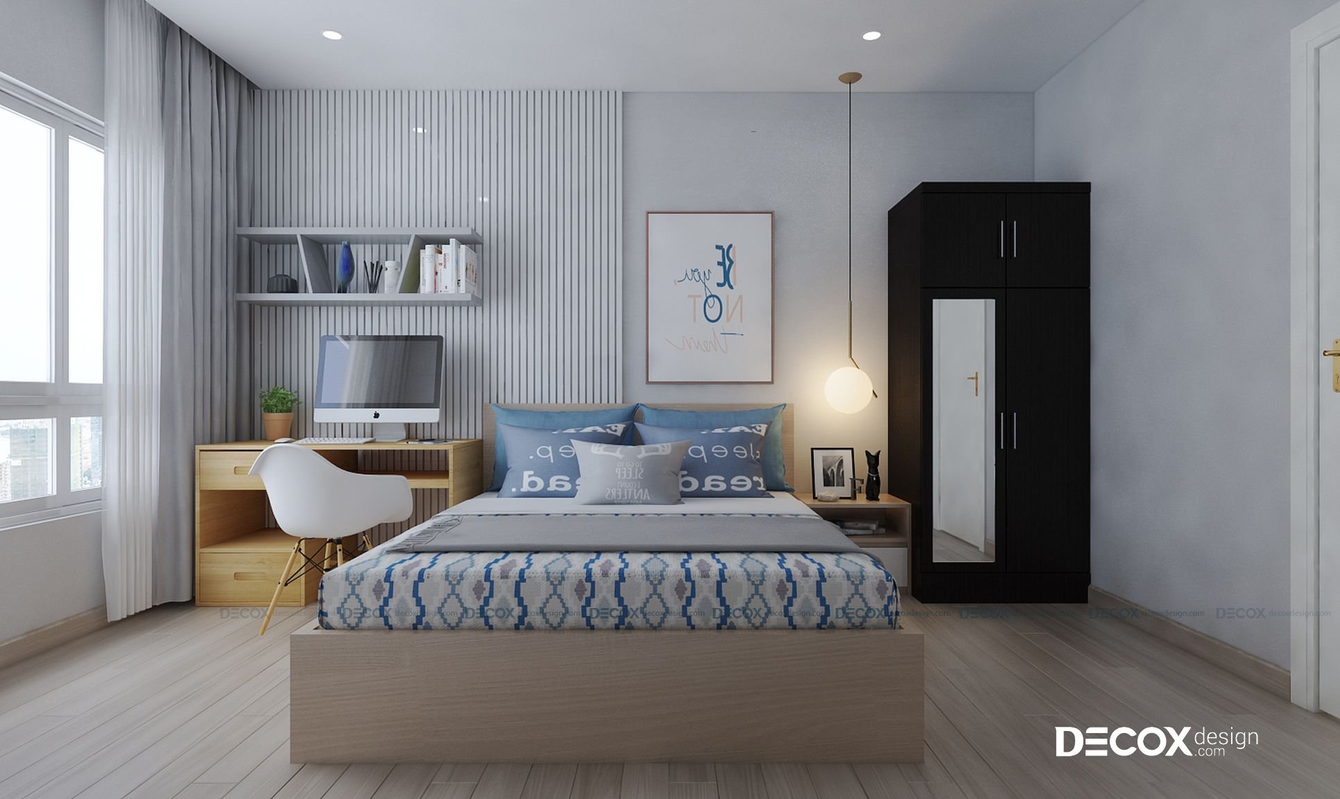 Phòng ngủ nhỏ được thiết kế với gam màu nhẹ nhàng. Giường ngủ được đặt ở giữa hai bên là bàn học bằng gỗ và tủ để đồ màu đen. Cửa sổ được thiết kế rộng đảm bảo đầy đủ ánh sáng trong quá trình học tập.