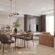 Vách tường kính thủy màu xám sau ghế sofa mang đến vẻ sang trọng. Hệ kệ tủ thấp sau ghế sofa chạy dọc theo mảng tường vừa là nơi chứa đồ dùng vừa được tận dụng để làm kệ trang trí.